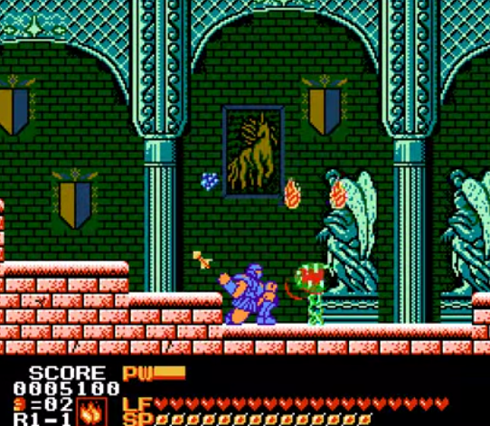 You have energy three bars: the first is a power gauge showing how hard you hit the enemy. This descreases anytime you swing your weapon at an enemy. When you stop attacking, the bar increases again. The length of your power bar increases as you find power-ups. The second is your health bar, and the third is your magic bar. Unlike the arcade version, the NES version can only be played in one player mode.