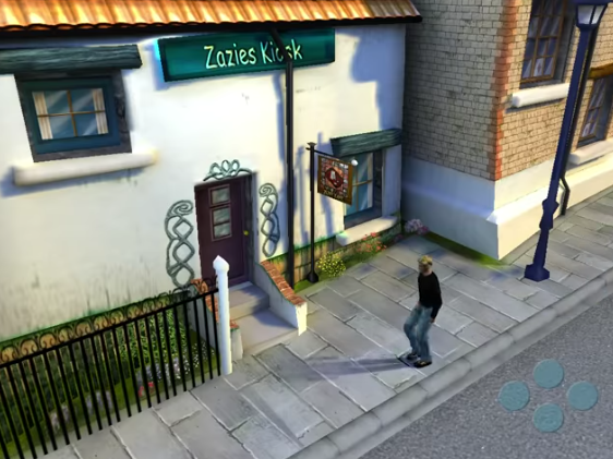 Broken Sword 3: The Sleeping Dragon is the first and only game of the series to break away from the point-and-click style of gameplay. The game itself is more action driven. You can control your character making them walk, run, and creep, and there is an introduction of a new action menu. When you near something or someone that you can interact with, a little animated star-type cursor will appear on that something or someone. At the same time, a symbol will appear in the bottom right screen where there is a template of four buttons in the shape of a diamond. You have the choice to click which action you wish to take. There are also instances in the game where you need to time your actions precisely, else you may die and have to restart the action scene.