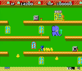 You play as a blue bird called Flicky who must save all the little Chirps before they are eaten by the Tiger cats and Iggy lizards. To save a Chirp, you simply walk past them, and they begin to follow you. Once they are following you, you need to escort them to the door where they can escape, and you gain points. The more Chirps you rescue at any one time, the higher your points multiplier. The speed with which you rescue the Chirps is also a factor when accumulating points. You must do this whilst avoiding the cats and lizards which kill you as soon as they touch you. Thankfully, you can defend yourself by picking up various objects and hurling them at the beasties.